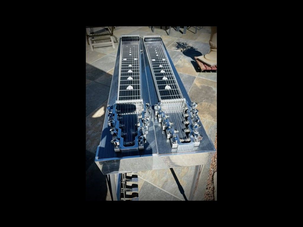 A very beautifull steel full options with a big configuration: 4 floor, 5 knee and 2 designed Half stop (very rare). This steel is a piece of art all builded with ball bearing for softness and Häussle handwire pickups (fantastic tone). This steel is lacquer finished red/dark sunbust with wooden neck. One of the best sounding steel I've ever use. Few hour of playing almost no traces of use, this steel is in mint condition.